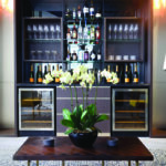 Characterized by rich color, bold geometry, and decadent detail work; the living room is vibrant. A fixed dining area was not needed so they planned for a drop-down table with a beautiful etched glass top. When closed this etched glass forms part of the wall panel; with mirrors on either side, that help creates an illusion of volume.